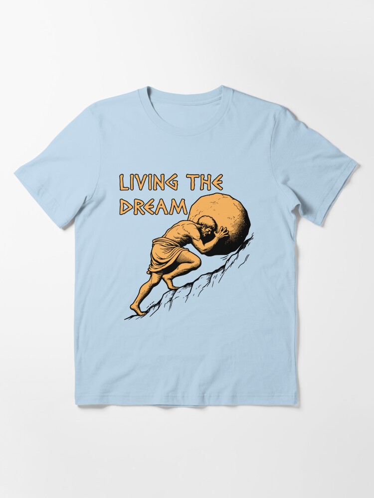 Living The Dream – Sisyphus, Greek Mythology Meme Unisex T-Shirt t-shirt for men and women – bold printed design, premium cotton blend, comfortable fit. Shop unique statement tees at UrbanTeeShop today!