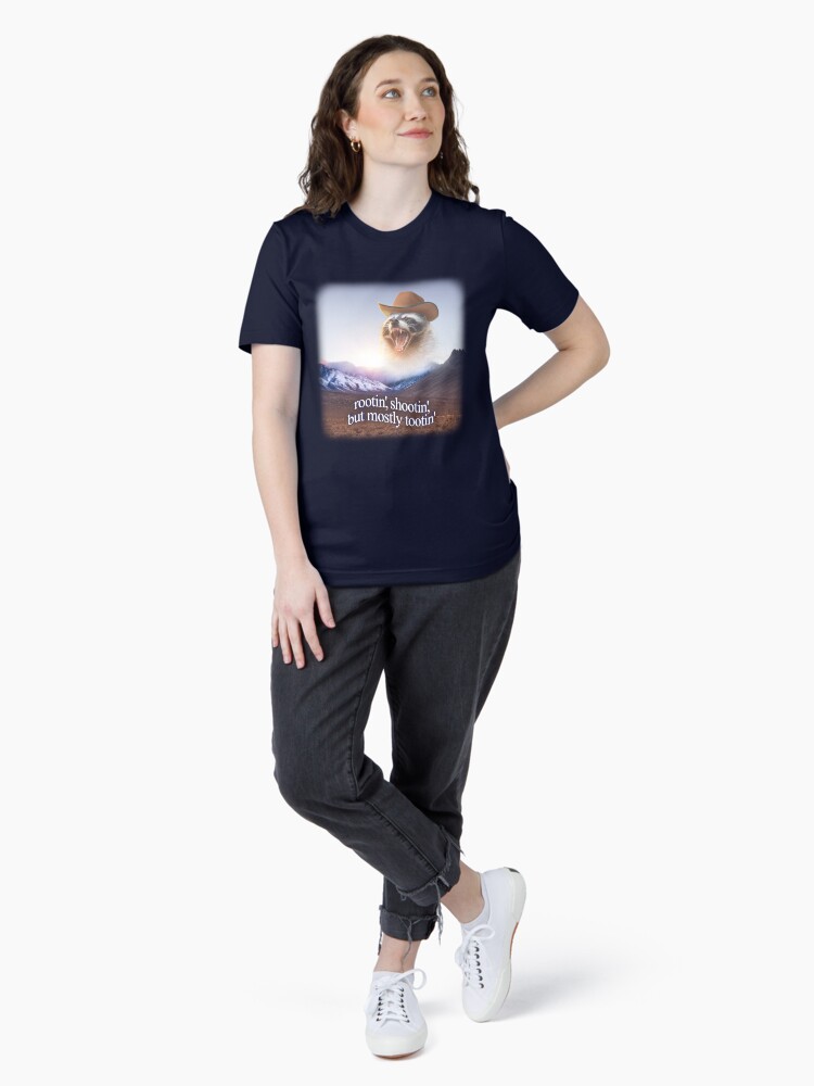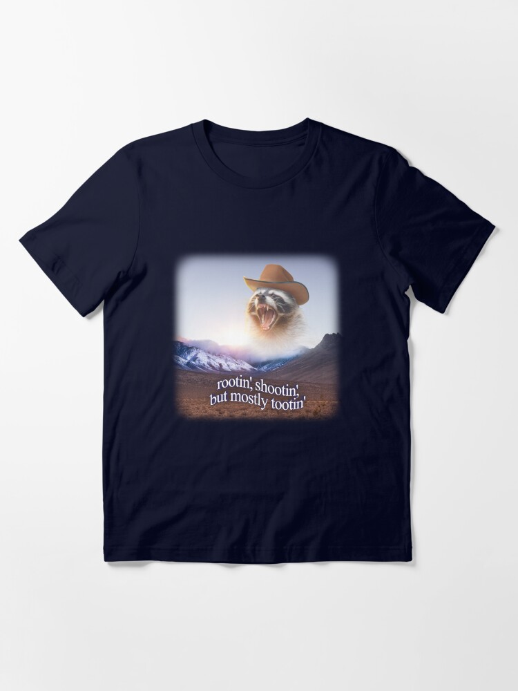 Rootin shootin but mostly tootin cowboy raccoon word art Unisex T-Shirt t-shirt for men and women – bold printed design, premium cotton blend, comfortable fit. Shop unique statement tees at UrbanTeeShop today!